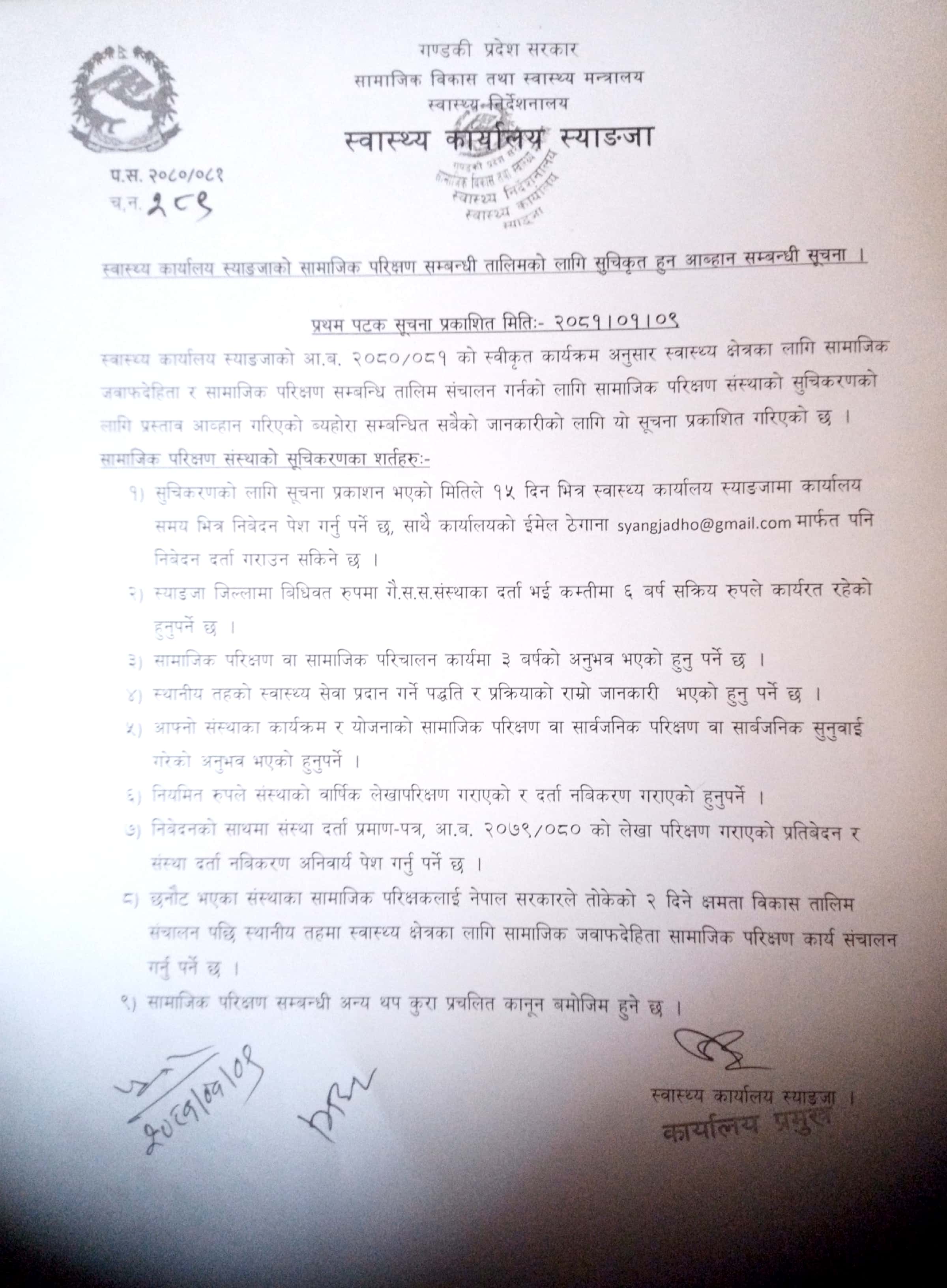 सामाजिक परिक्षण सम्वन्धी तालिमको लागि सुचिकृत हुन सूचना सम्बन्धमा।